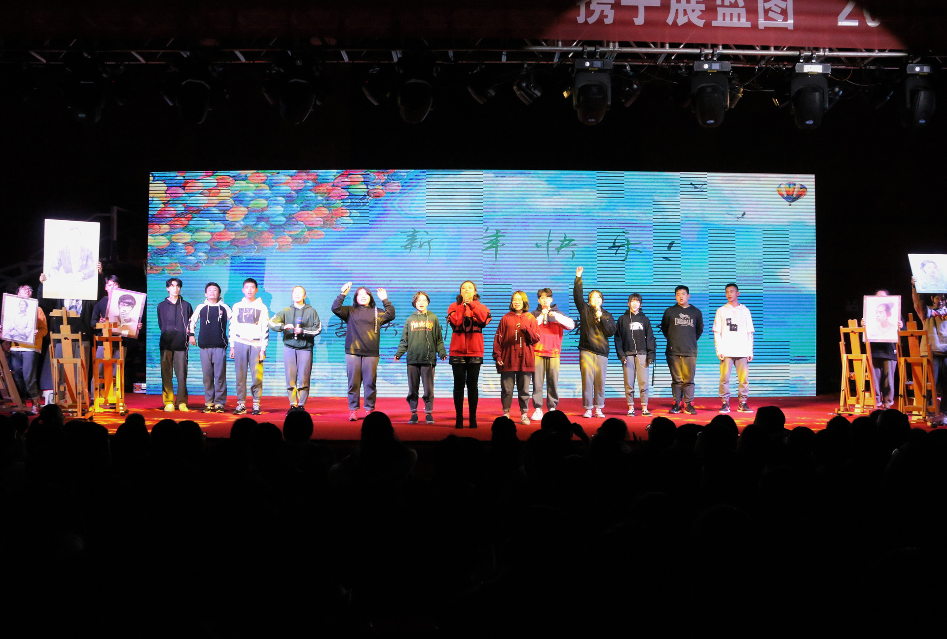 元旦晚会以“艺起炫青春,携手展蓝图”为主题词,节目形式多种多样,歌舞秀、历史剧、经典诗歌朗诵、吉他弹唱、舞蹈串烧、大合唱等一一精彩呈现,其中教师节目《女人花》更是震撼全场,赢得同学们的热烈掌声和欢呼声。表演者们精彩的演出充分展现了我校师生朝气蓬勃、健康向上的精神风貌,整台晚会不仅洋溢着活力与朝气,更体现着“我们是相亲相爱的一家人”的温暖氛围。晚会在行政领导、演员和工作人员的合影中落下帷幕。晚会结束后,张胜利校长亲切看望了道具组、后勤保障组的学生志愿者们,对他们默默奉献、甘当幕后英雄的可贵精神给予了充分的肯定。